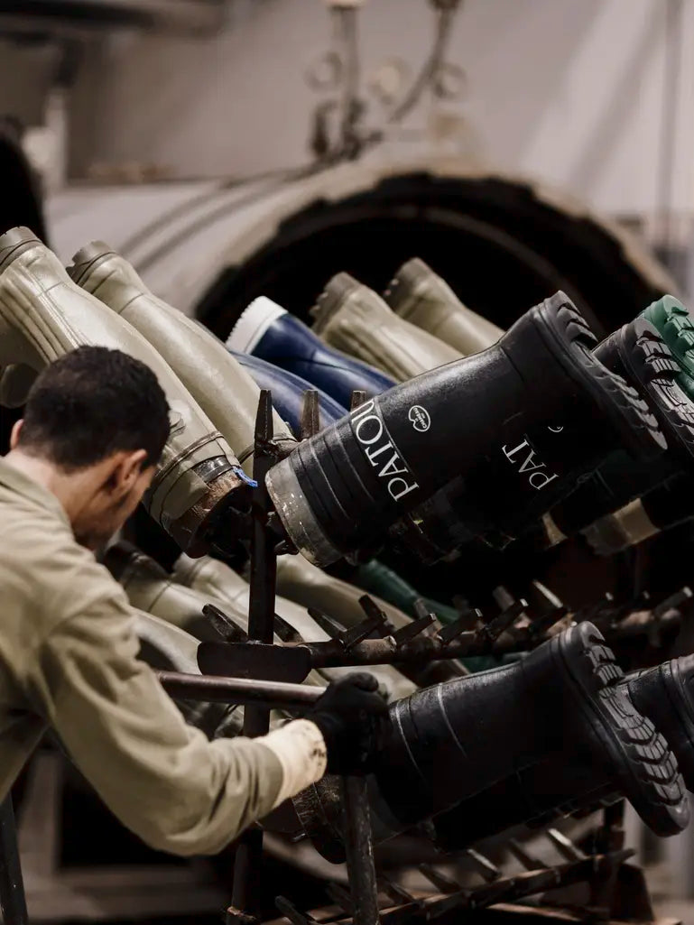 The final stage of creating a Le Chameau boot involves a process called vulcanisation, whereby the rubber is cooked at a precise temperature and for a set period of time to ensure optimum flexibility and durability. Once cooled, every boot is tested in water to make sure it is fully waterproof. Another quality control check and a polish follows to complete the process before the boots are wrapped and boxed, ready to make their way to their new owner.
