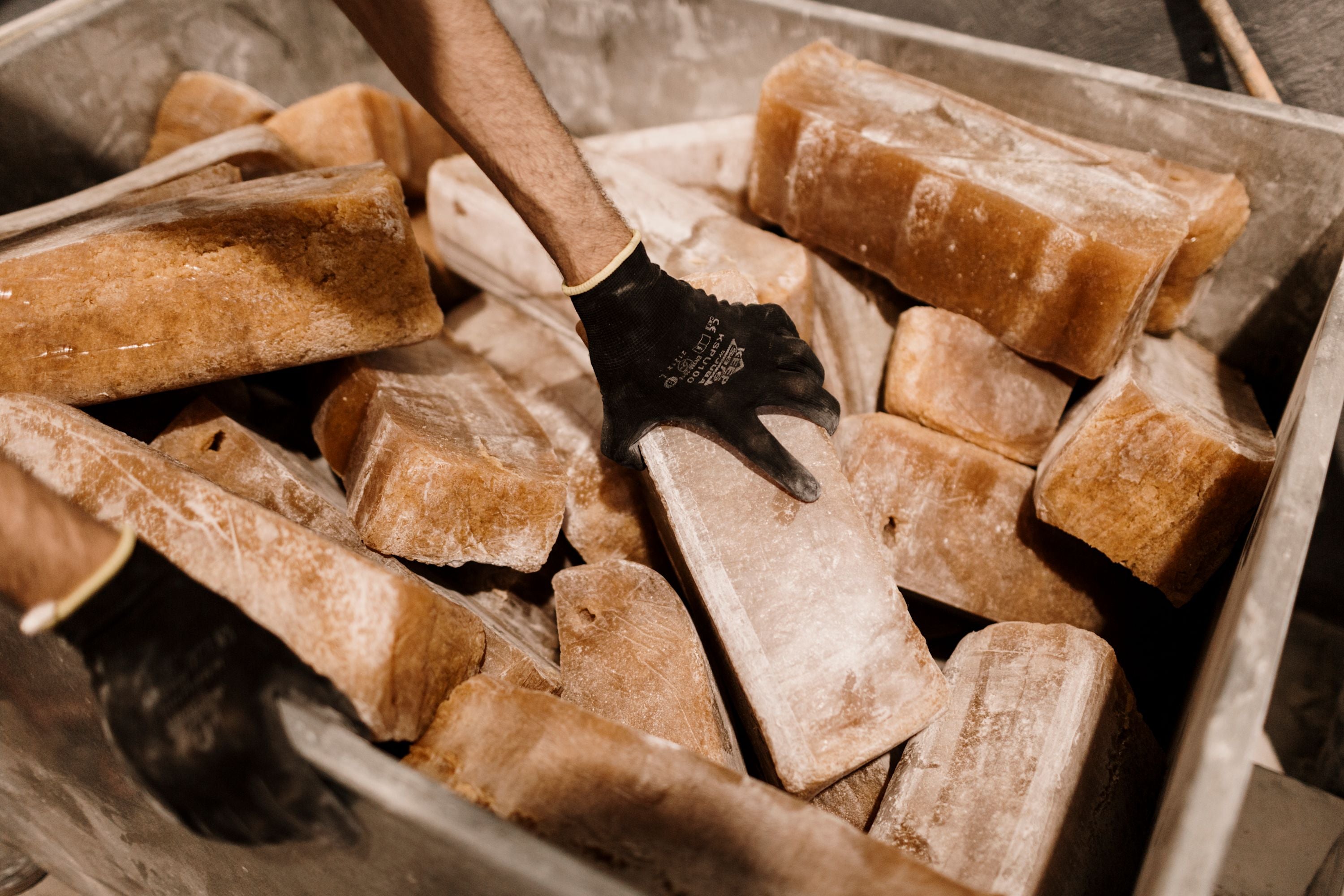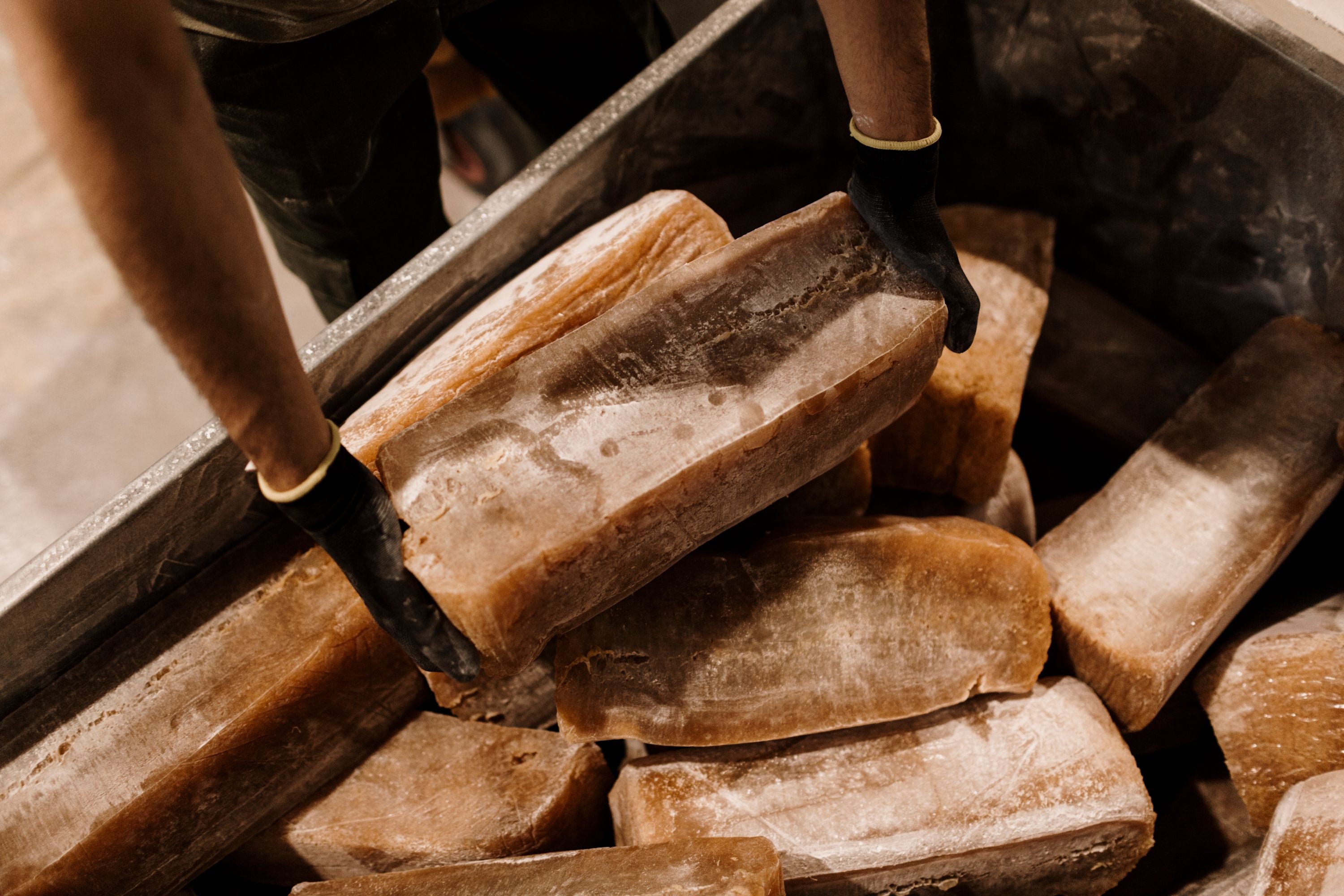 To produce natural rubber, each Pará rubber tree – otherwise known as Hevea brasiliensis – is ‘tapped’, producing raw latex, a milky white substance. Sensibly harvested, this can be done without harming the trees. The liquid latex is allowed to coagulate and can then be collected and processed into its dry form which is packed into loaves. The loaves are graded from A to D – the grading determined by colour, purity and stickiness. Le Chameau uses only Grade A rubber, which is light coloured and has low ash and dirt content. These loaves of raw Grade A rubber are then shipped to our workshop in Morocco.