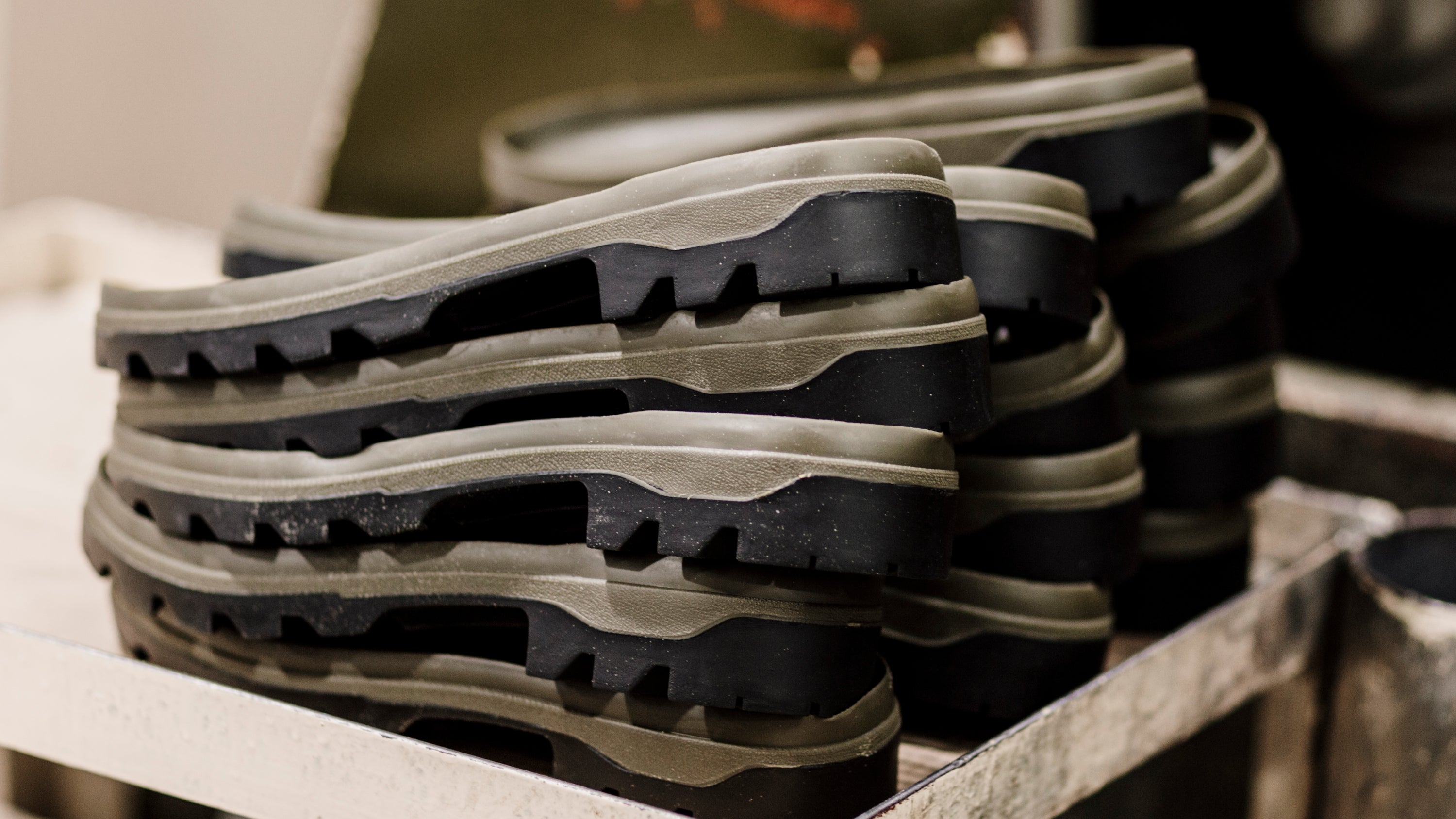Nous avons différents types de semelles, chacune ayant un processus de construction légèrement différent. Pour chaque type de semelle, la semelle de base est réalisée en versant notre caoutchouc au fond d’un moule en deux parties. Le moule est fermé, mis sous pression et cuit. Comme le caoutchouc chauffe et se propage à travers le moule, il prend la forme de la semelle. Différents éléments sont ensuite ajoutés au processus, selon le type de semelle souhaité. Par exemple, le renfort de cambrion sur nos modèles Chasseur, Vierzon, ou la spécificité de la semelle Cérès, développée en partenariat avec MICHELIN, pour répondre spécialement aux besoins des professionnels de l’agriculture. La partie extérieure de la semelle utilise la technologie auto-nettoyante des pneus MICHELIN Ultraflex, distribuant le poids uniformément et offrant une meilleure adhérence sur un sol mou. En marchant, la boue se déloge naturellement de la semelle.