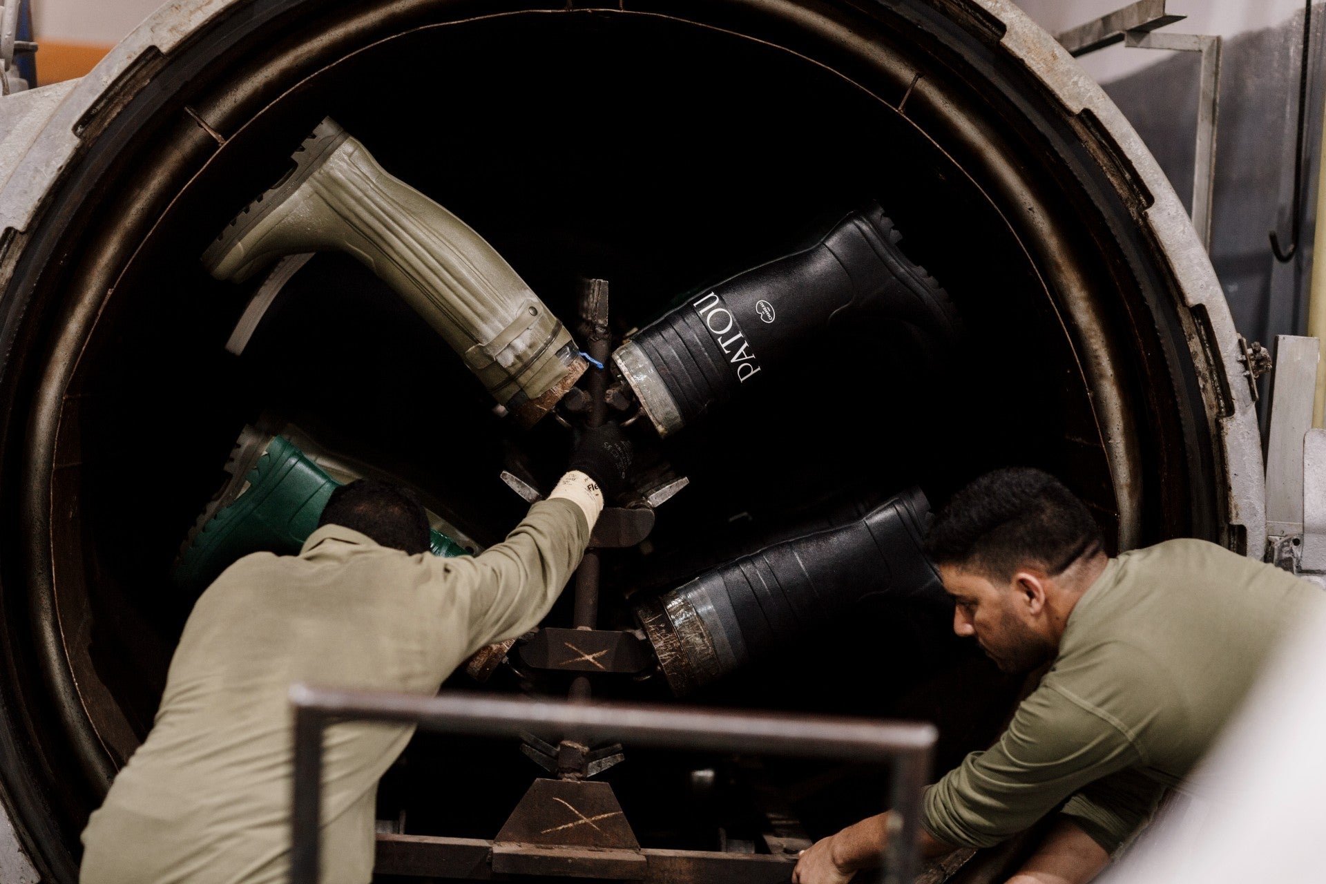Once the boot is fully assembled, we 'cook' it. This stabilises the rubber and fuses the many layers of rubber and lining together, forming one incredibly strong structure. Each style of boot requires different temperatures and timings. Once cooled, the aluminium last is removed and the boot is ready for final quality control checks.